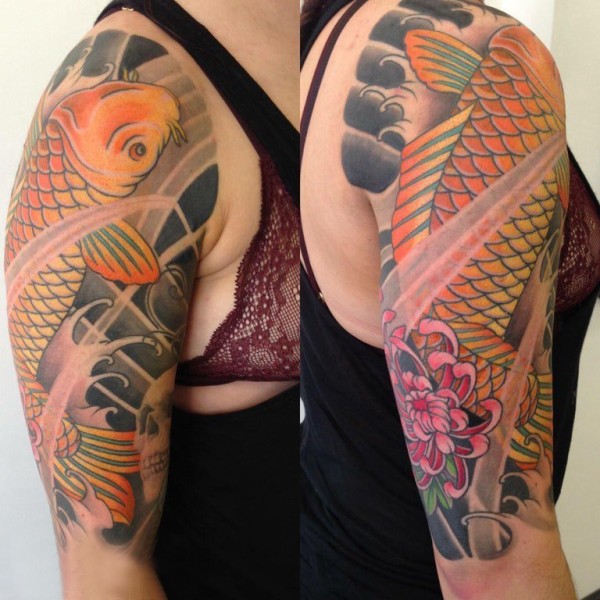 鲤鱼纹身线条 女生大臂上花朵和鲤鱼纹身图片