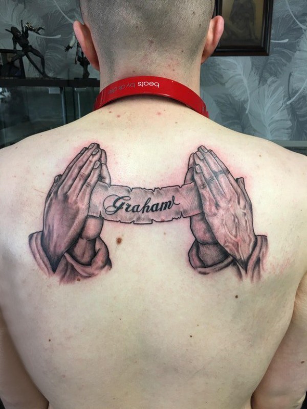 后背纹身男 男生后背上英文和祈祷之手纹身图片