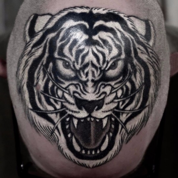 头顶纹身 男生头部黑色的老虎纹身图片