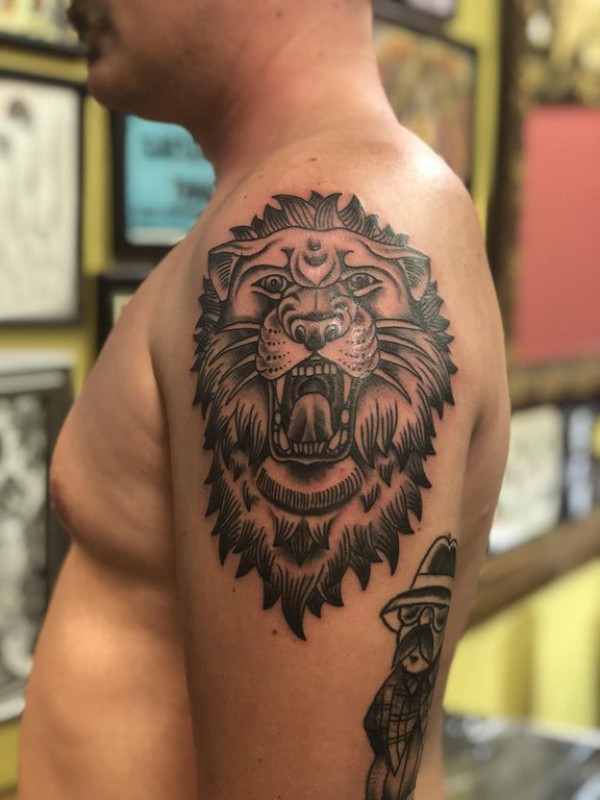 双大臂纹身 男生大臂上黑色的狮子纹身图片