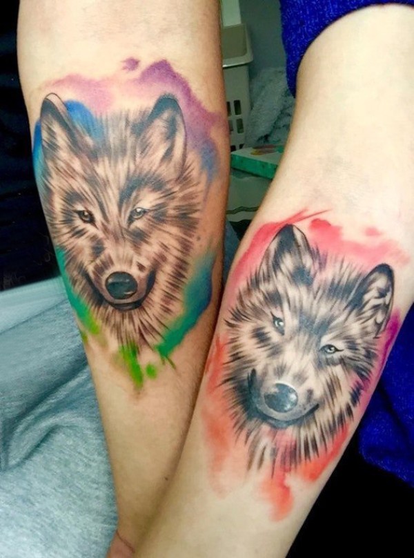 手臂纹身图片 情侣手臂上彩色的狼头纹身图片