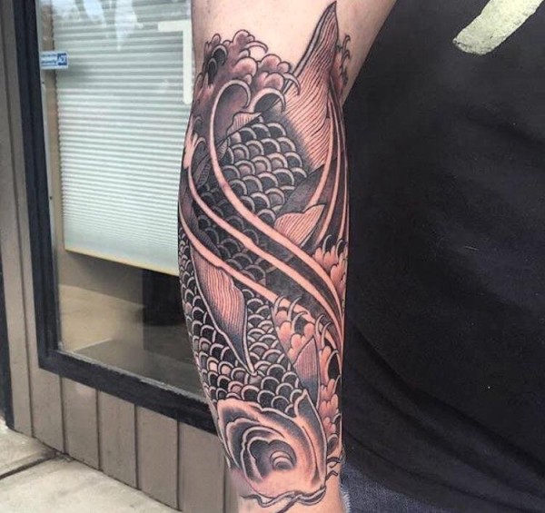 手臂纹身素材 男生手臂上黑色的鲤鱼纹身图片