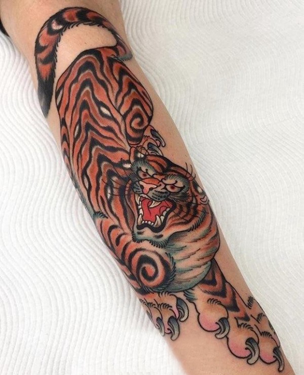 手臂纹身图片 男生手臂上彩色的老虎纹身图片