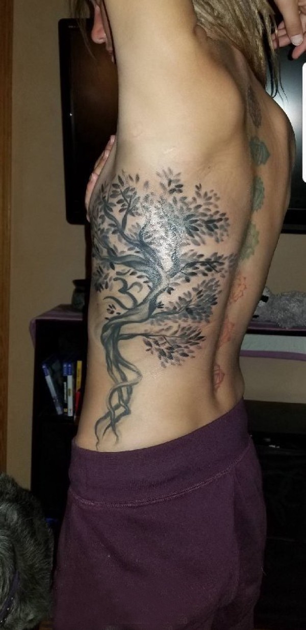 侧腰纹身女 女生侧腰上黑色的大树纹身图片