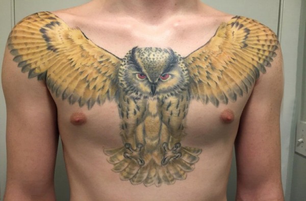 纹身胸部男 男生胸部彩绘的猫头鹰纹身图片