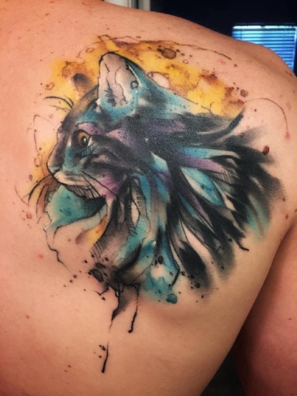 后背纹身男 男生后背上彩色的猫咪纹身图片