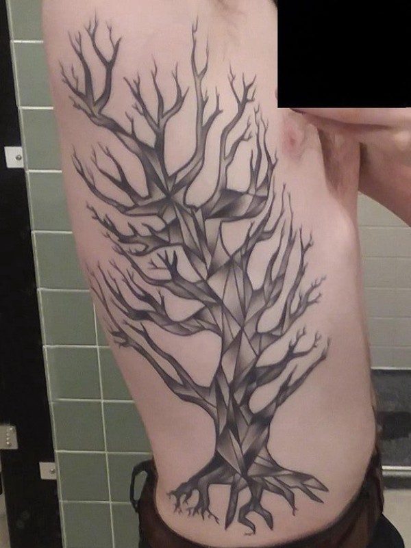 纹身树枝 男生侧腰上黑色的枯树纹身图片