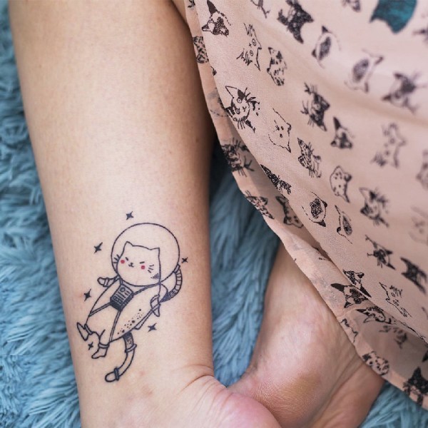 纹身卡通 女生小腿上黑色的卡通猫咪纹身图片