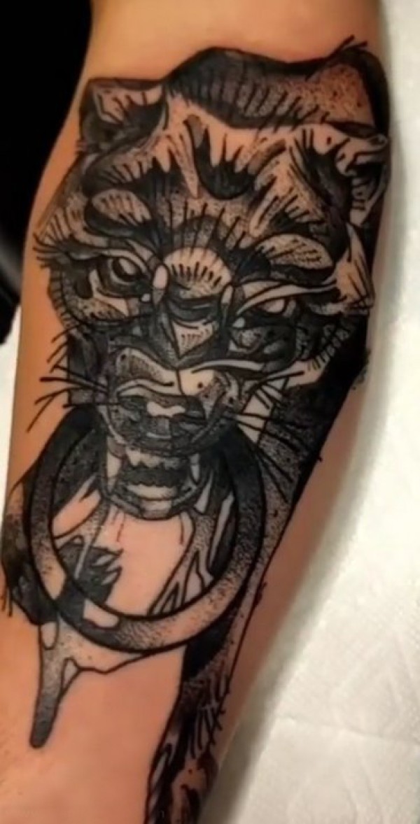 纹身黑色 男生手臂上圆形和狼头纹身图片