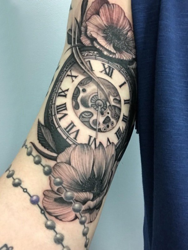 纹身黑色 男生手臂上花朵和时钟纹身图片