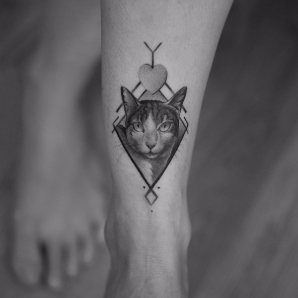 欧美线条纹身 女生小腿上菱形和猫咪纹身图片