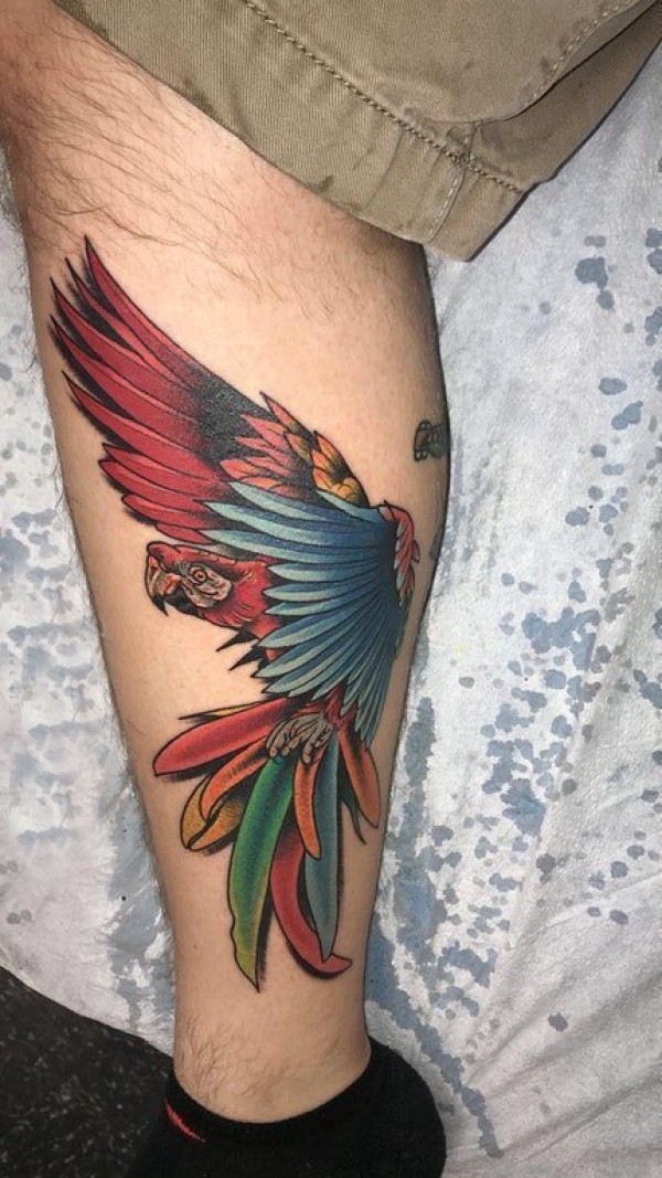 欧美小腿纹身 男生小腿上彩色的鹦鹉纹身图片