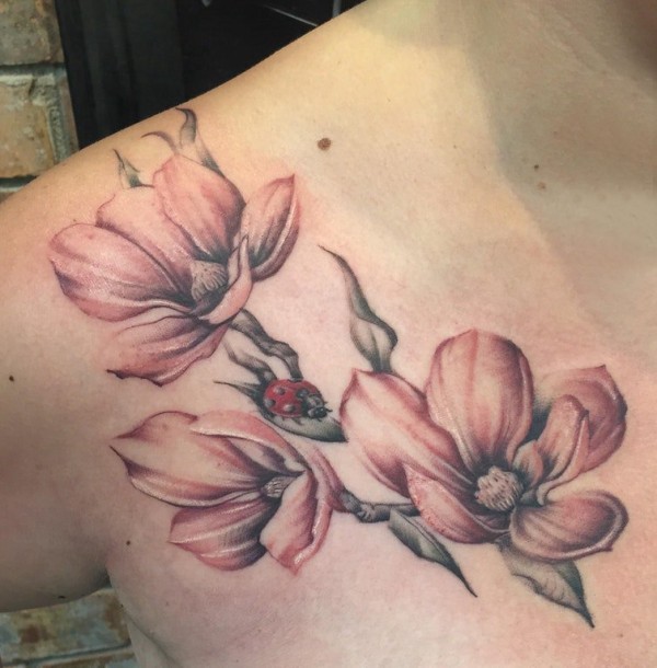肩部纹身图案 女生肩部彩色的木兰花纹身图片