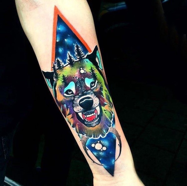 手臂纹身图片 男生手臂上菱形和狼头纹身图片