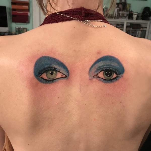 纹身后背女 女生后背上彩色的眼睛纹身图片