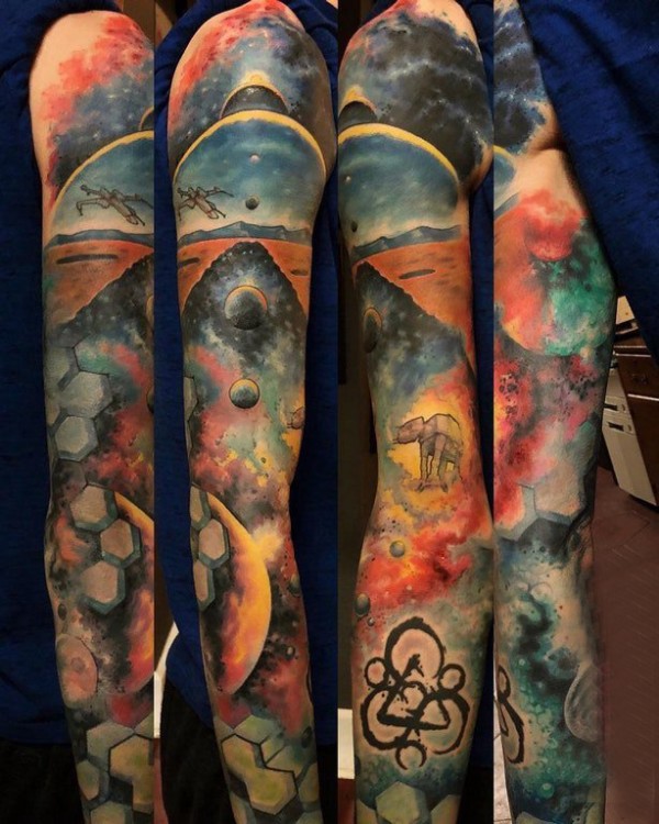 手臂纹身素材 男生手臂上彩色的风景纹身图片