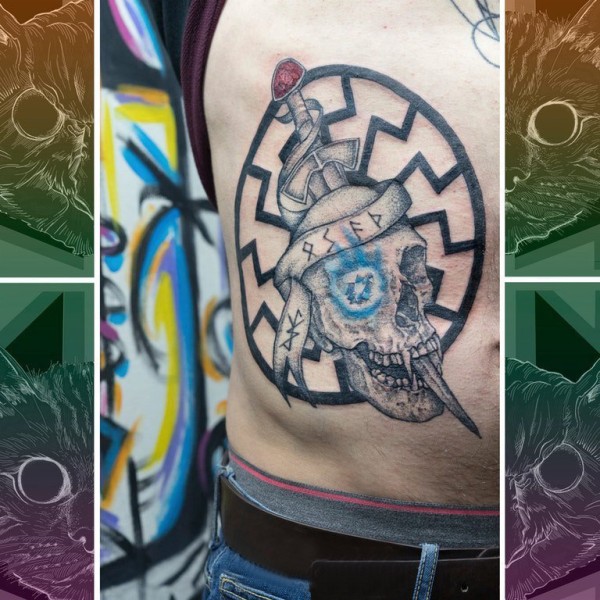 纹身侧腰男 男生侧腰上匕首和骷髅纹身图片
