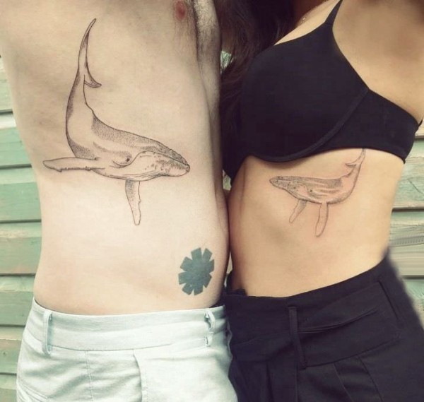 小动物纹身 情侣侧腰上黑色的鲸鱼纹身图片