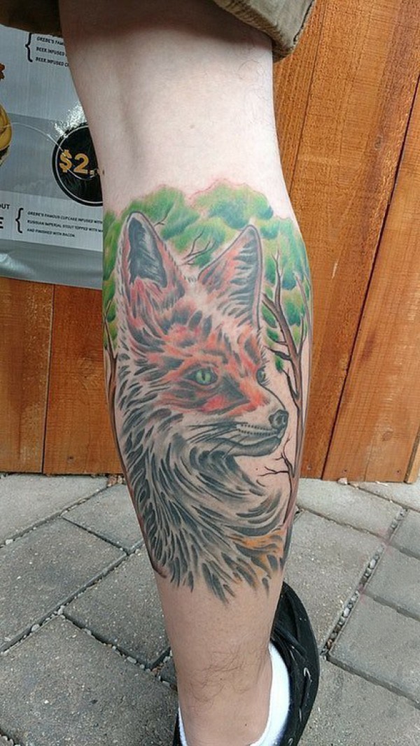 小动物纹身 男生小腿上大树和狐狸纹身图片