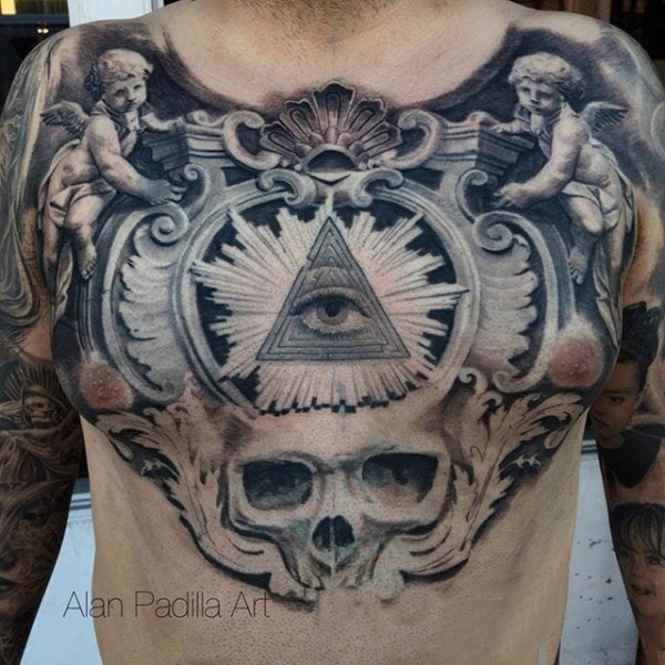 新传统风格的9张男性黑灰大满背纹身图案图片