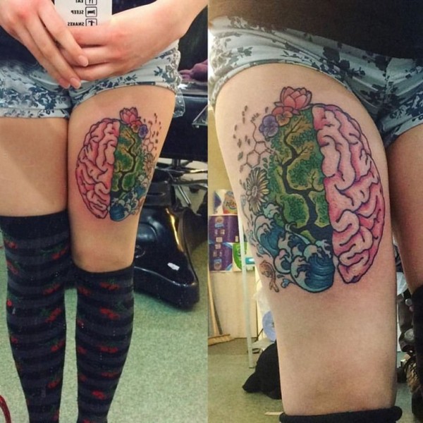 大腿传统纹身 女生大腿上彩色的大脑纹身图片