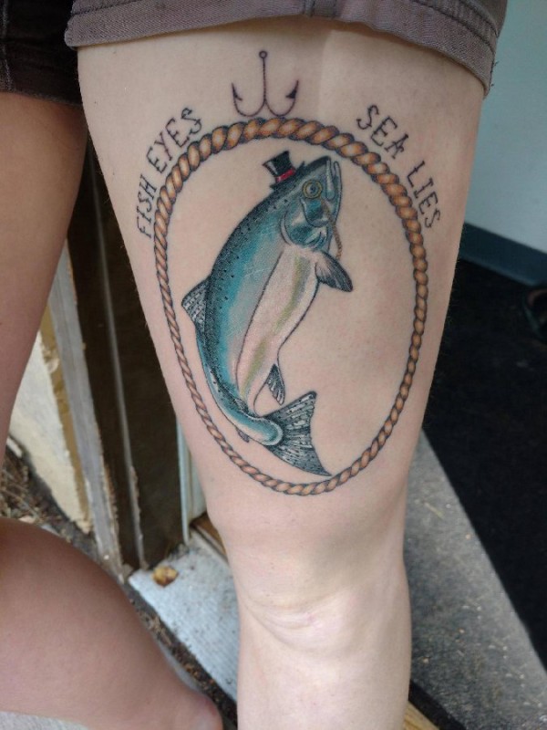 大腿纹身男 男生大腿上英文和鱼纹身图片