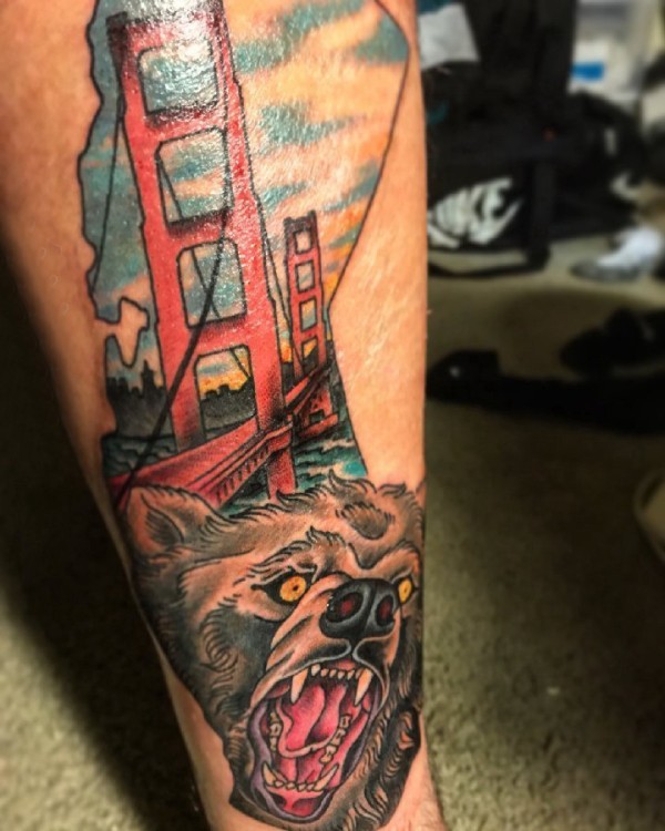 欧美小腿纹身 男生小腿上熊和桥梁纹身图片