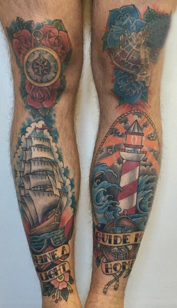 腿部纹身 男生小腿上帆船和灯塔纹身图片