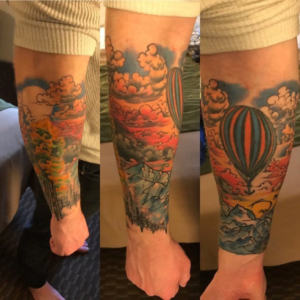 手臂纹身素材 男生手臂上热气球和风景纹身图片