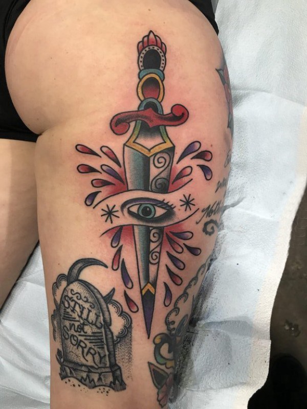 大腿传统纹身 女生大腿上眼睛和匕首纹身图片