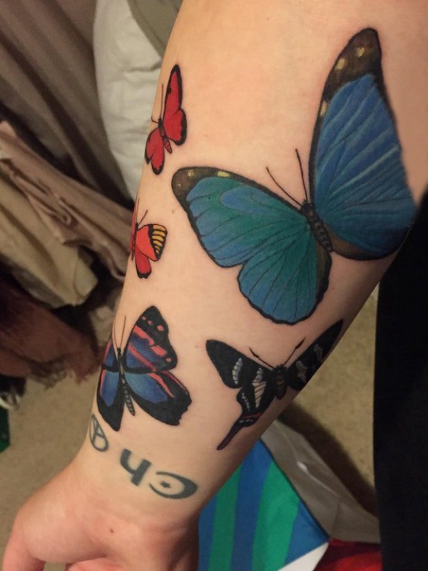 小动物纹身 女生手臂上彩色的蝴蝶纹身图片