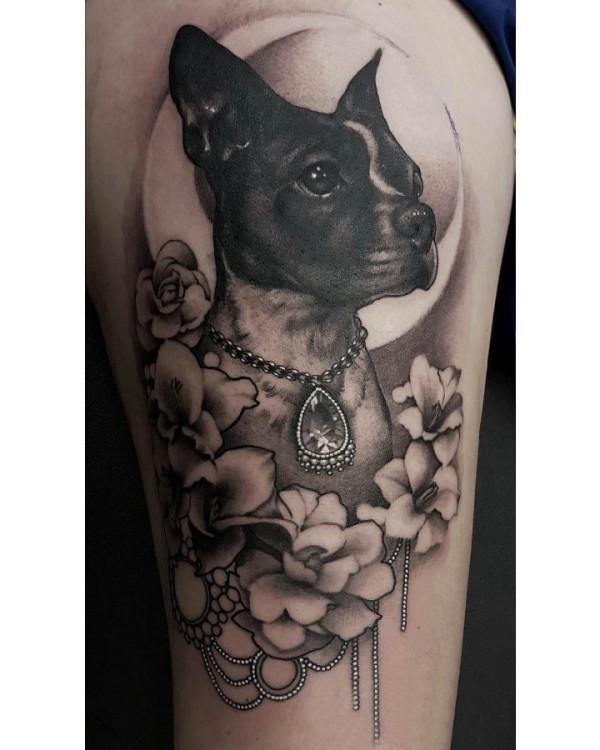 大腿上彩色植物纹身小花朵和狗头纹身图片