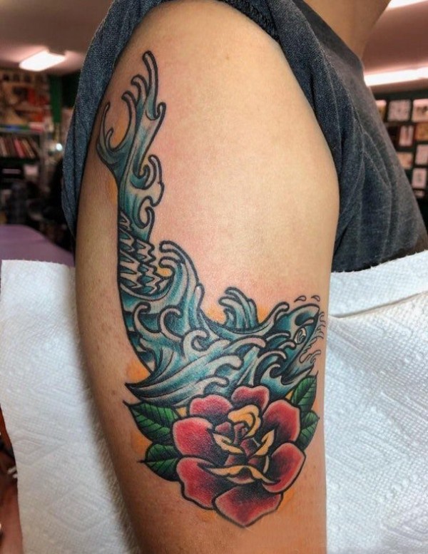 双大臂纹身 男生大臂上花朵和鲸鱼纹身图片