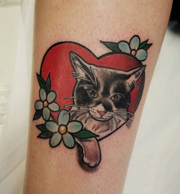 小清新猫咪纹身 女生手臂上花朵和猫咪纹身图片
