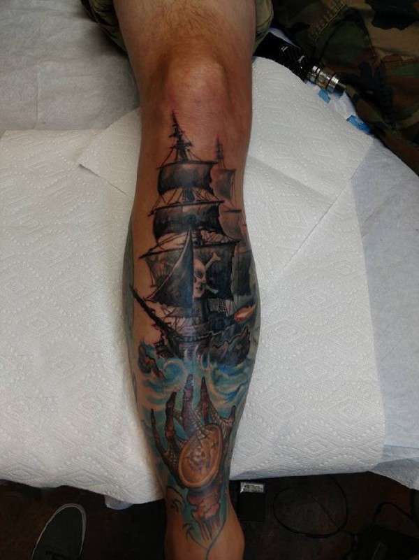小腿对称纹身 男生小腿上彩色的海盗船纹身图片