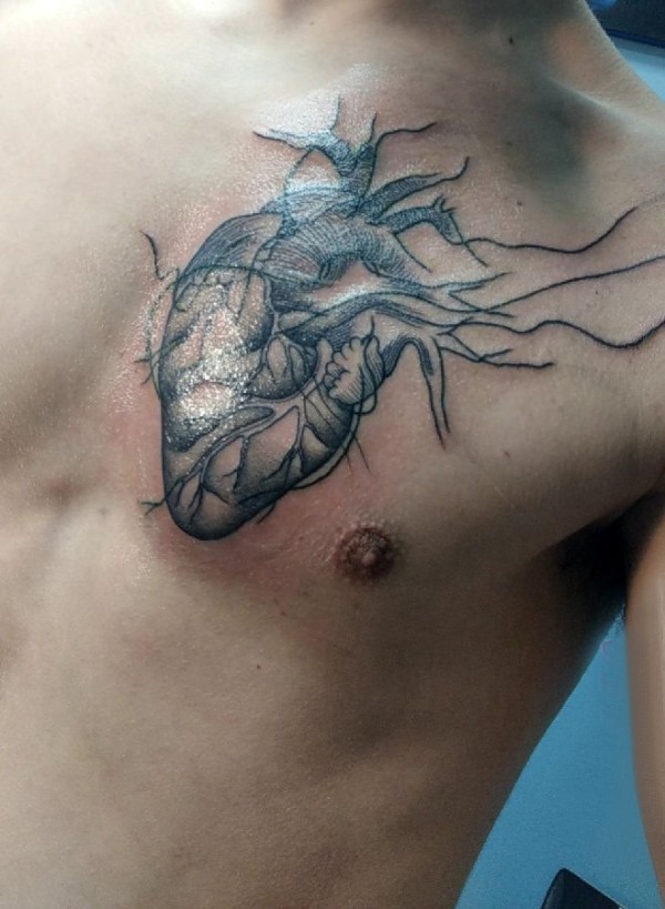 胸部纹身男 男生胸部黑色的心脏纹身图片