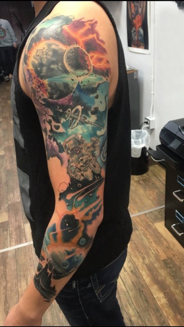小宇宙纹身 男生手臂上彩色的星球纹身图片
