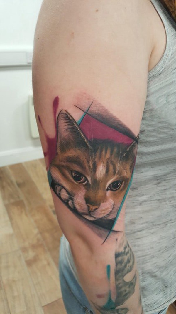 大臂纹身图 女生大臂上几何和猫咪纹身图片