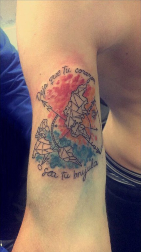 彩色渐变纹身 男生手臂上英文和地图纹身图片