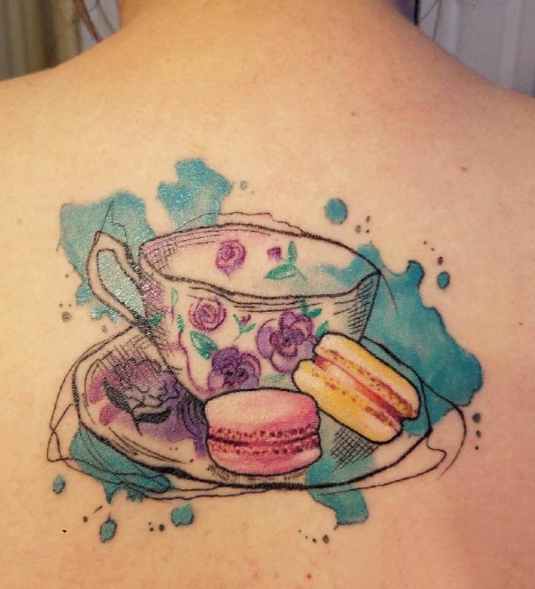 后背纹身女 女生后背上食物和茶杯纹身图片
