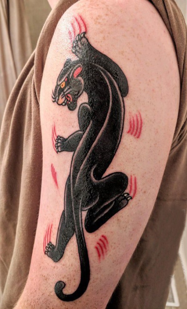 大臂纹身图 男生大臂上彩色的豹子纹身图片