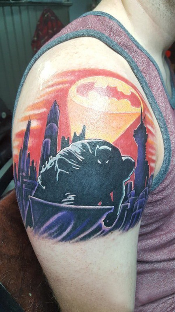 大臂纹身图 男生大臂上蝙蝠侠和风景纹身图片
