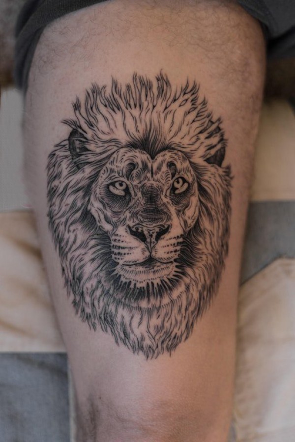 狮子头纹身图片 男生大腿上狮子头纹身图片