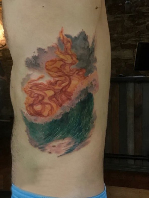 侧腰纹身男 男生侧腰上火焰和海浪纹身图片