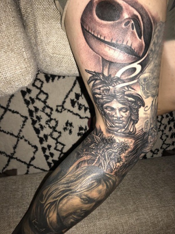 人物肖像纹身 女生腿上素描的人物肖像纹身图片