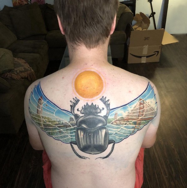 后背纹身男 男生后背上太阳和昆虫纹身图片
