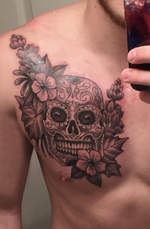 骷髅纹身 男生胸上骷髅和花卉纹身图片