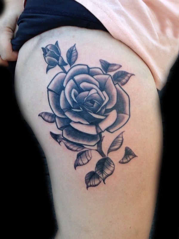 大腿纹身图女 女生大腿上黑色的玫瑰纹身图片
