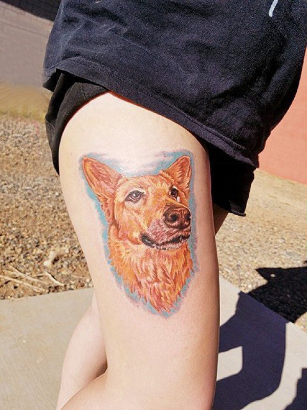 百乐动物纹身 女生大腿上彩色的小狗纹身图片