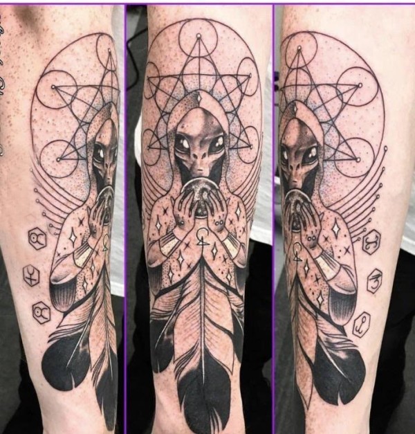 手臂纹身图片 男生手臂上圆形和外星人纹身图片
